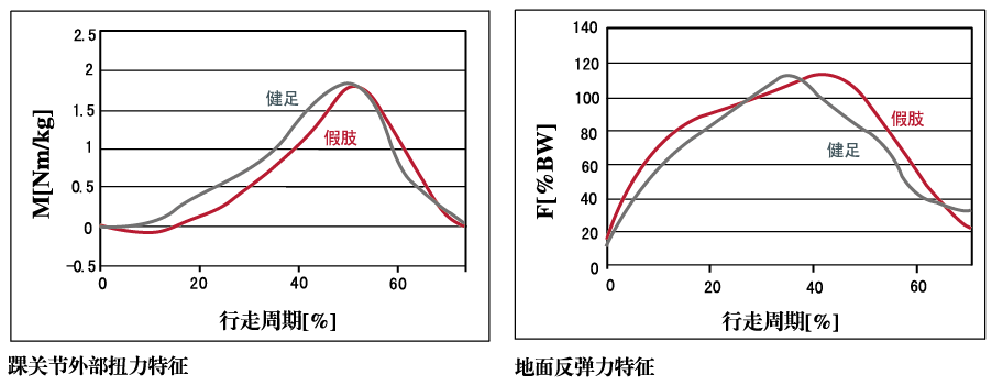 踝关节运动曲线的特征显示了脚板和缓平衡的滚动运动状态,与人体正常运动相比,踝关节屈曲角度的最高点和健足之间没有明显的差距,假脚非常接近健足踝关节的运动状态。在足跟着地时地面反弹最大时假脚和健足也非常接近,表明假肢的功能和健肢非常类似,在行走过程中可以有效地减轻对健足的压力。