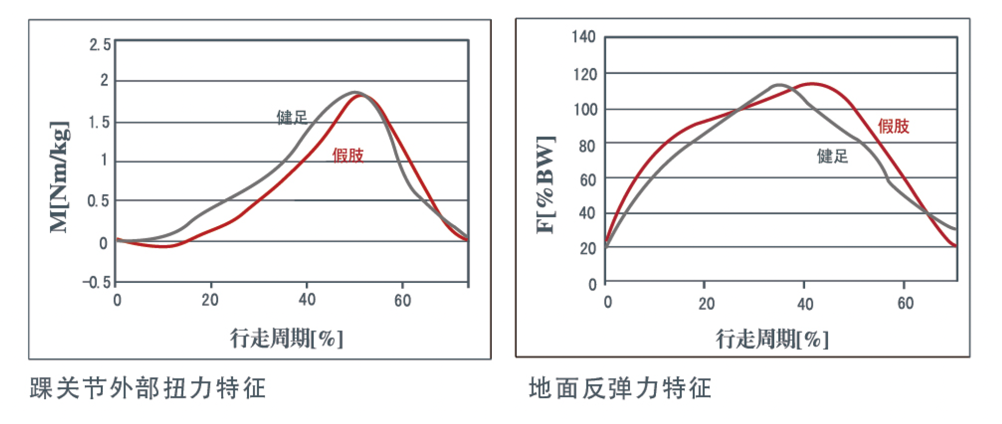 踝关节运动曲线的特征显示了脚板和缓平衡的滚动运动状态,与人体正常运动相比,踝关节屈曲角度的最高点和健足之间没有明显的差距,假脚非常接近健足踝关节的运动状态。在足跟着地时地面反弹最大时假脚和健足也非常接近,表明假肢的功能和健肢非常类似,在行走过程中可以有效地减轻对健足的压力。
