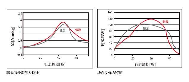 在足跟着地时地面反弹最大时假脚和健足也非常接近,表明假肢的功能和健肢非常类似,在行走过程中可以有效地减轻对健足的压力(如右图)。