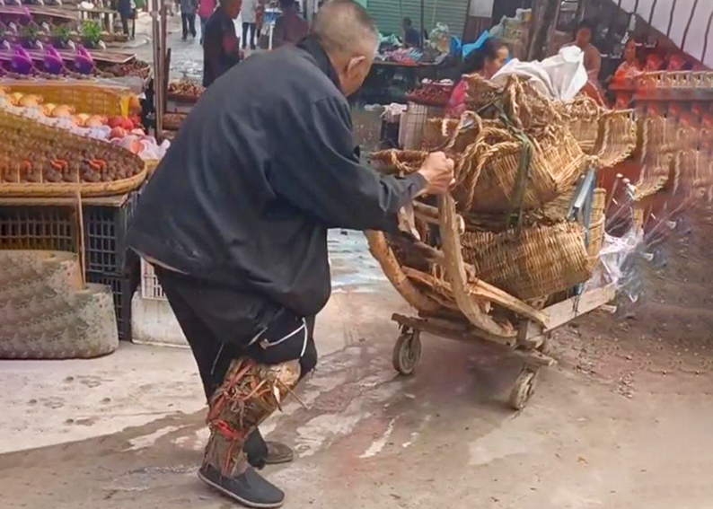 在人来人往的街头,一位身穿深色衣服的大爷佝偻着身子,推着一辆简易的木制小车,上面装满了各种各样的竹编制品。