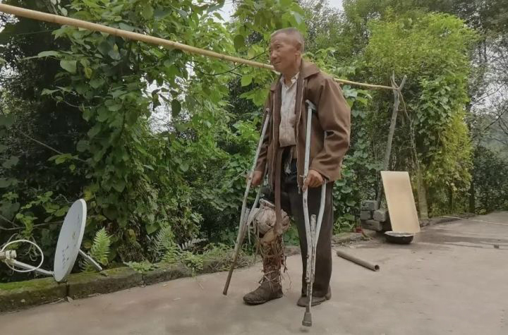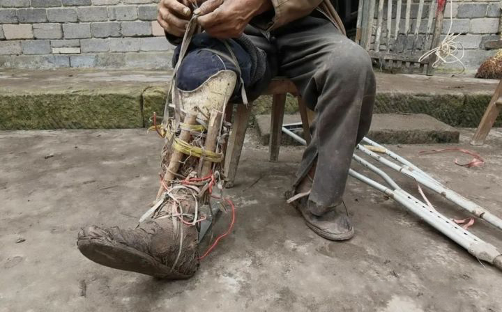 残障大爷用木棍电线自制假肢令人心酸 当地:下周带他免费安假肢